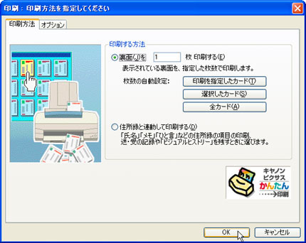 | 宛名面を印刷するには、次のように操作します。 ※ここでは、Canon製のプリンタ「PIXUS iP7500」を例に解説します。なお、ドライバのインストールなどの準備はすでに終了し、プリンタが利用できる状態にあることとします。 |