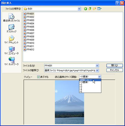 目的の画像を選択し、[読込画像のサイズ調整]の▼をクリックし、「(調整しない)」を選択して、[開く(O)]ボタンをクリックします。 ※[読込画像サイズ調整]は、初期設定では「-1」に設定されています。画像の縮小率を-1〜-5の間で設定することができますが、透過情報をもったPNG形式の画像を貼り付ける場合は、縮小すると透過されないため、必ず「(調整しない)」を選択してください。 ![]() |