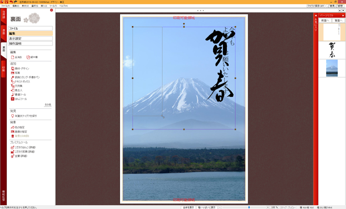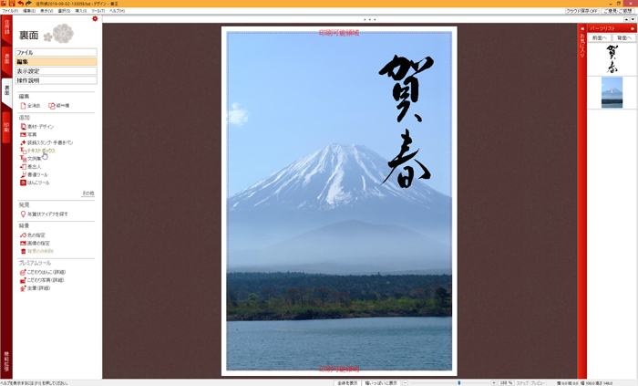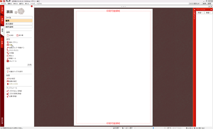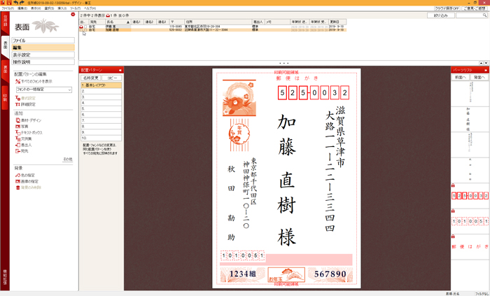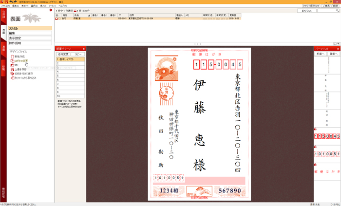 画面左端の「表面」タブをクリックし、左側上部にある「ファイル」の[デザインファイル]の「はがきの変更」をクリックします。![]() |