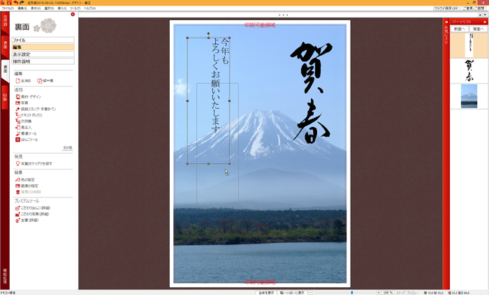 「書式設定バー」のフォントを選択し、文字のサイズを選択して、[配置]のボタンで縦書きか横書きかを選択し、はがき内に表示された入力欄をクリックして文字を入力します。入力が終わったら、[編集画面に戻る]ボタンをクリックします。![]() |