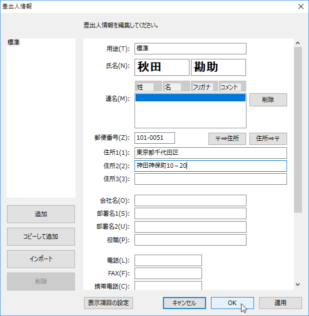 [氏名(N)]に姓と名を分けて入力します。 | ||||||||||||||||||