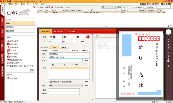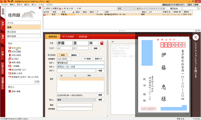 画面左端の「住所録」タブをクリックし、[差出人]の[登録・編集]をクリックします。 ※操作ガイドの画面が表示された場合は閉じてください。操作ガイドが不要な場合は、[次回から表示しない]をONにしてから閉じるとよいでしょう。 ![]() |
