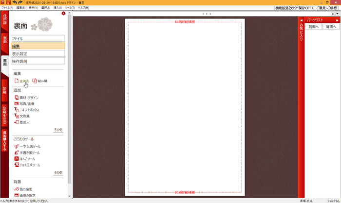 画面左端の「裏面」タブをクリックし、左側上部にある「編集」をクリックして、中段に表示された[編集]の「全消去」をクリックします。![]() |