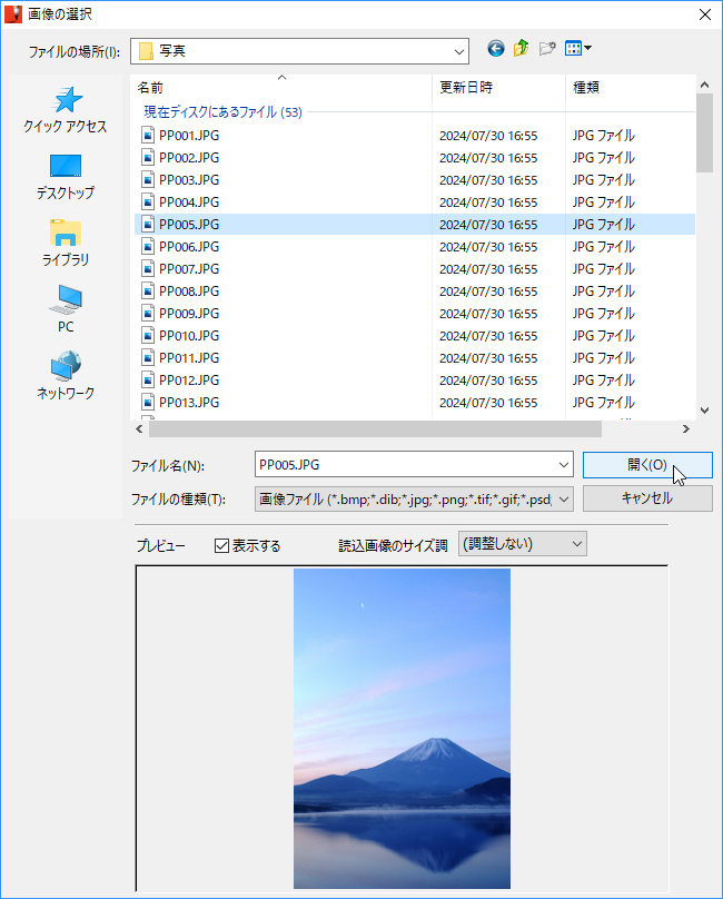 目的の画像を選択し、[開く(O)]ボタンをクリックします。![]() |
