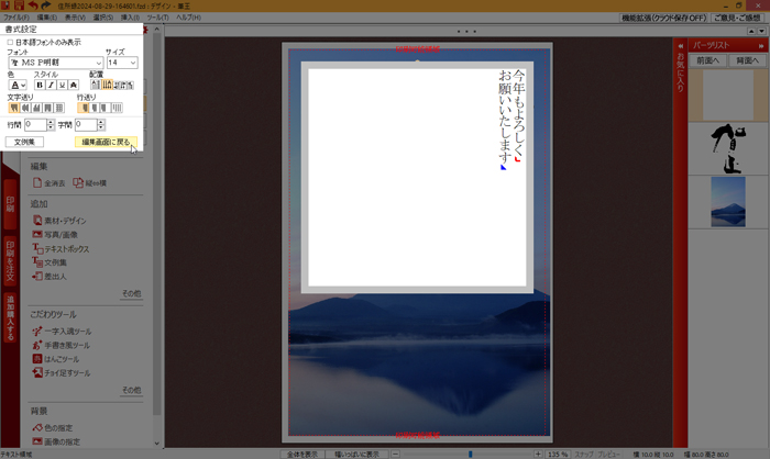「書式設定バー」のフォントを選択し、文字のサイズを選択して、[配置]のボタンで縦書きか横書きかを選択し、はがき内に表示された入力欄をクリックして文字を入力します。入力が終わったら、[編集画面に戻る]ボタンをクリックします。![]() |