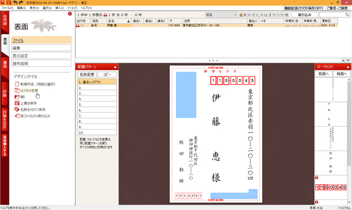 画面左端の「表面」タブをクリックし、左側上部にある「ファイル」の[デザインファイル]の「はがきの変更」をクリックします。![]() |