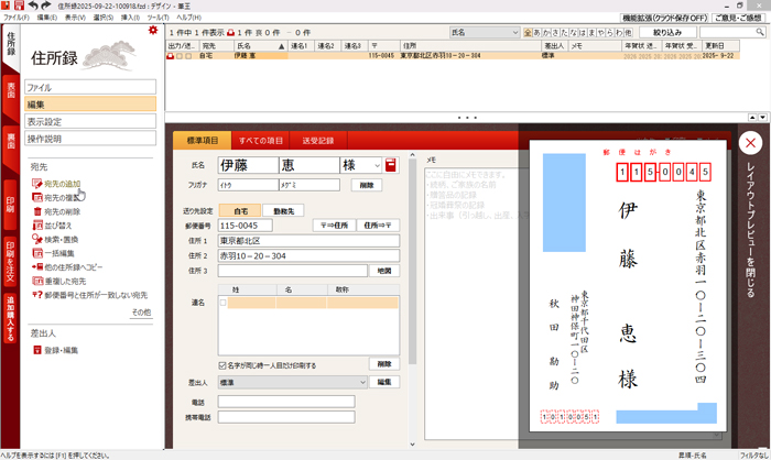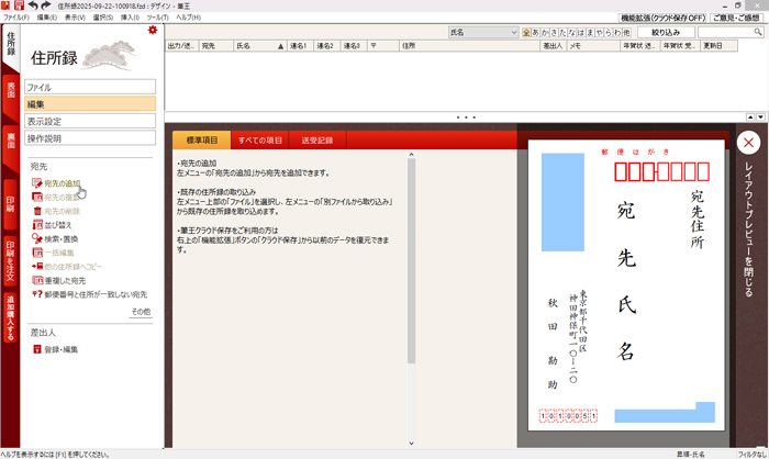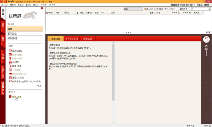 画面左端の「住所録」タブをクリックし、[差出人]の[登録・編集]をクリックします。 ※操作ガイドの画面が表示された場合は閉じてください。操作ガイドが不要な場合は、[次回から表示しない]をONにしてから閉じるとよいでしょう。 ![]() |