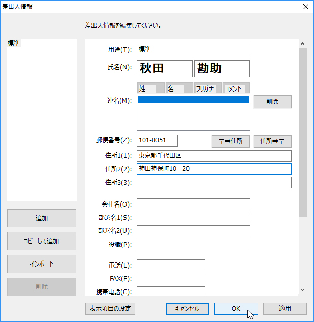 [氏名(N)]に姓と名を分けて入力します。 | ||||||||||||||||||