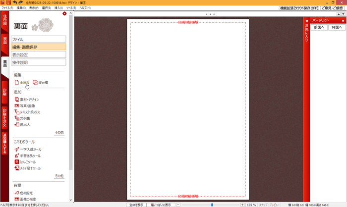 画面左端の「印刷」ボタンをクリックし、[印刷]の「裏面のみ」をクリックします。![]() |