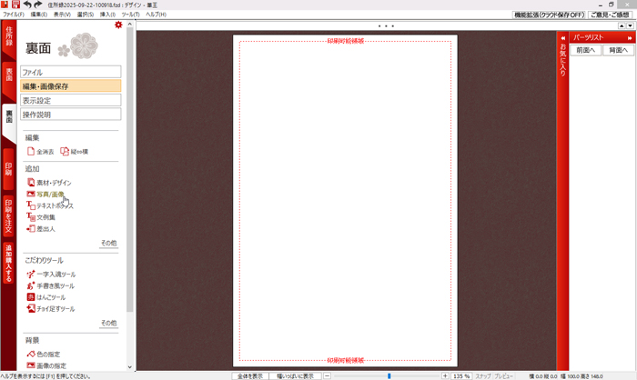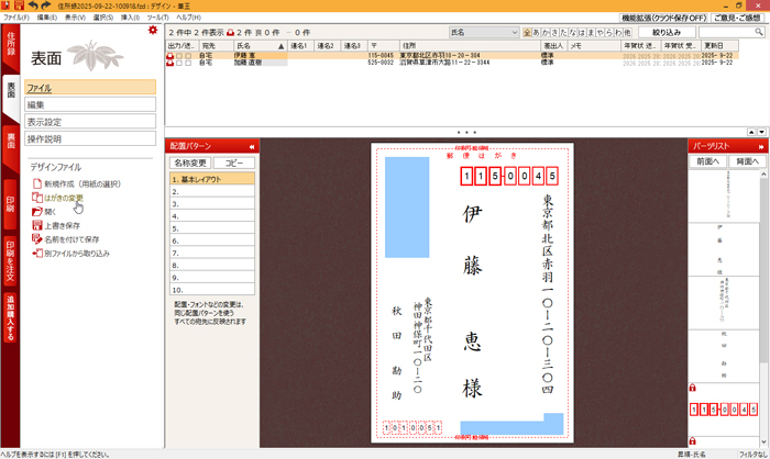 画面左端の「表面」タブをクリックし、左側上部にある「ファイル」の[デザインファイル]の「はがきの変更」をクリックします。![]() |