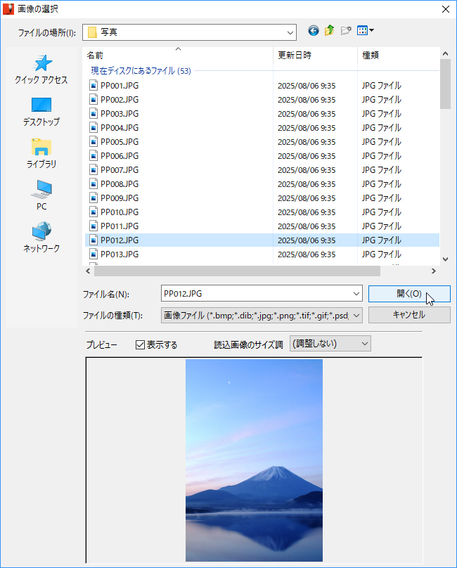 目的の画像を選択し、[開く(O)]ボタンをクリックします。![]() |