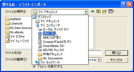 [ファイルの場所(I)]の▼をクリックして、本書の付属DVD-ROMを選択します。![]() |