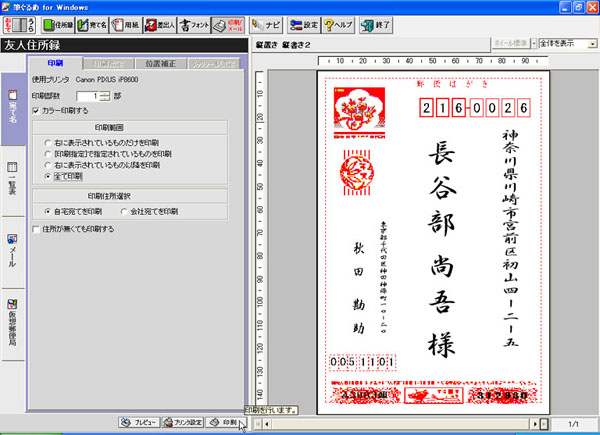 | はがきの文面を印刷するには、次のように操作します。 ※ここでは、Canon製のプリンタ「PIXUS iP8600」を例に解説します。なお、ドライバのインストールなどの準備はすでに終了し、プリンタが利用できる状態にあることとします。 |