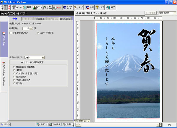 「キャノンプリンタ簡単設定」で用紙の種類を選択し、選択・編集画面の下部にある[印刷]ボタンをクリックします。![]() |