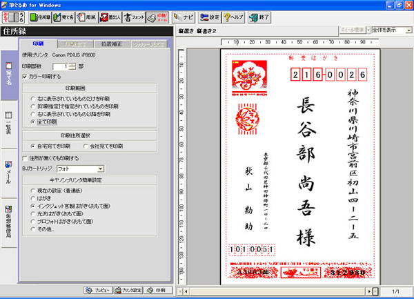 | はがきの文面を印刷するには、次のように操作します。 ※ここでは、Canon製のプリンタ「PIXUS iP8600」を例に解説します。なお、ドライバのインストールなどの準備はすでに終了し、プリンタが利用できる状態にあることとします。 |