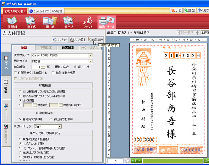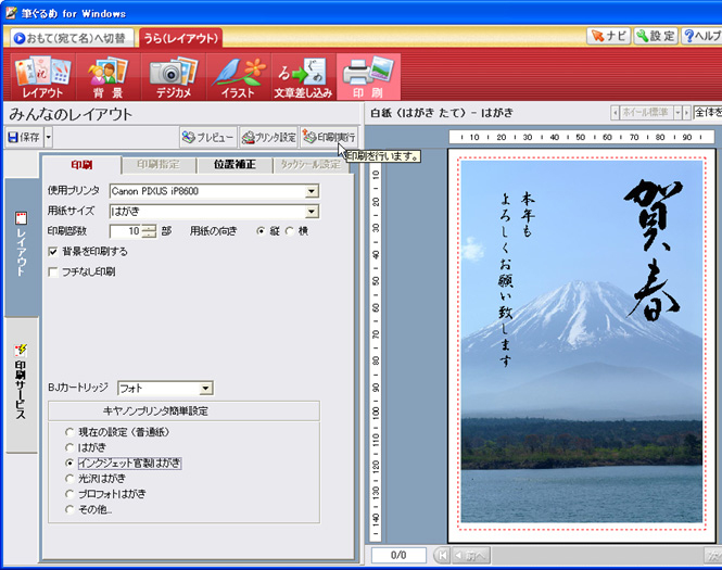 | はがきの文面を印刷するには、次のように操作します。 ※ここでは、Canon製のプリンタ「PIXUS iP8600」を例に解説します。なお、ドライバのインストールなどの準備はすでに終了し、プリンタが利用できる状態にあることとします。 |