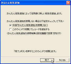 「かんたん宛先追加」ダイアログボックスで[今後「かんたん宛先追加」を使用しない]をONにし、[完了]ボタンをクリックします。 |