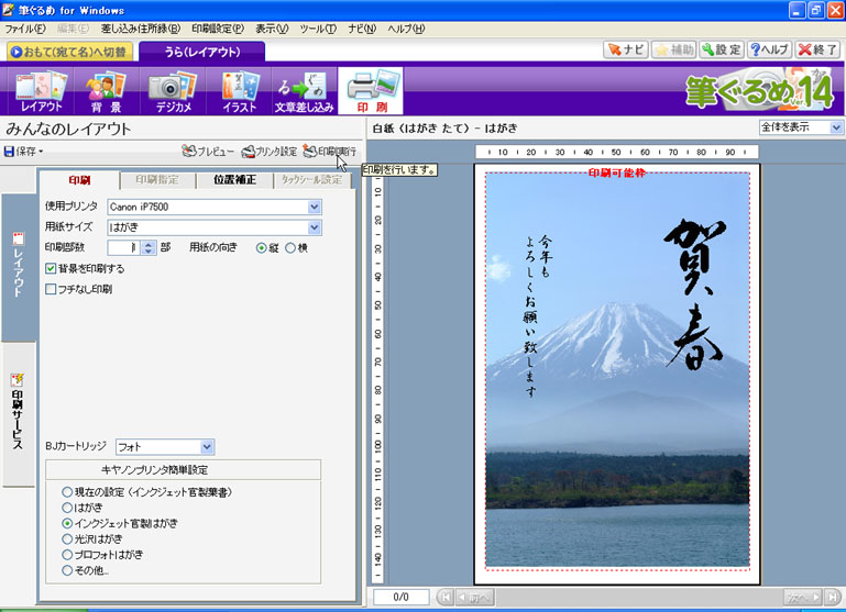 | はがきの文面を印刷するには、次のように操作します。 ※ここでは、Canon製のプリンタ「PIXUS iP7500」を例に解説します。なお、ドライバのインストールなどの準備はすでに終了し、プリンタが利用できる状態にあることとします。 |