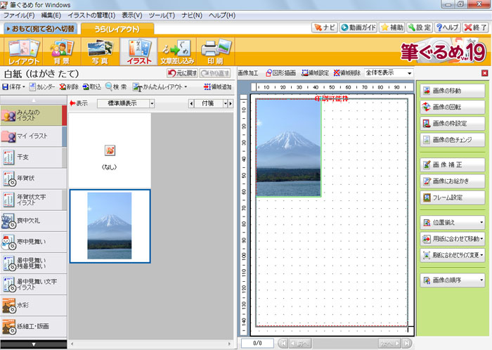 | 貼り付けたハガキ素材の上に文字を入力するには、次のように操作します。 | |||||||||||||||||||||