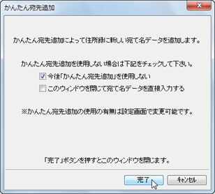 「かんたん宛先追加」ダイアログボックスで[今後「かんたん宛先追加」を使用しない]をONにし、[完了]ボタンをクリックします。 |