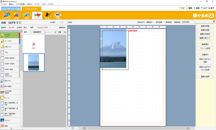 | 貼り付けたハガキ素材の上に文字を入力するには、次のように操作します。 | |||||||||||||||||||||