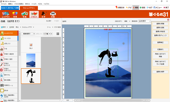 | 貼り付けたハガキ素材の上に文字を入力するには、次のように操作します。 | |||||||||||||||||||||