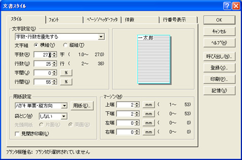 「スタイル」タブをクリックし、[用紙設定]の▼をクリックして、「ハガキ 単票・縦方向」を選択します。 | ||||||||||||||||||||