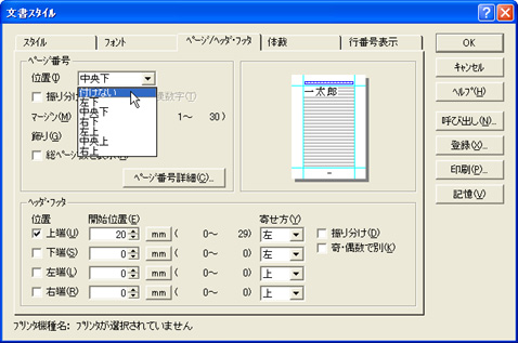 「ページ/ヘッダ・フッタ」タブをクリックし、[ページ番号]の[位置(I)]の▼をクリックして、「付けない」を選択します。![]() |