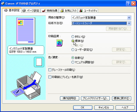 | はがきの文面を印刷するには、次のように操作します。 ※ここでは、Canon製のプリンタ「PIXUS iP7500」を例に解説します。なお、ドライバのインストールなどの準備はすでに終了し、プリンタが利用できる状態にあることとします。 |
