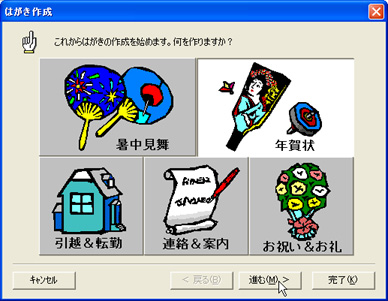 [年賀状]をクリックし、[進む(M)>]ボタンをクリックします。 ※用途に応じて選択してください。 ![]() |