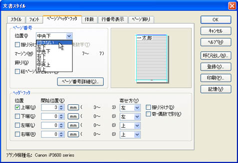 「ページ/ヘッダ・フッタ」タブをクリックし、[ページ番号]の[位置(I)]の▼をクリックして、「付けない」を選択します。![]() |