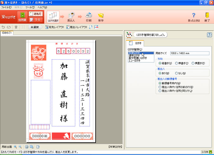 [はがき種類(C)]から「年賀はがき」を選択します。 ※用途に応じて選択してください。 ![]() |