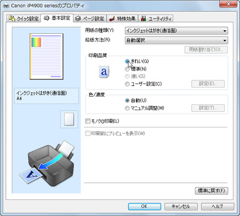 「基本設定」タブをクリックし、[用紙の種類(Y)]の一覧から目的の用紙の種類を選択します。 | ||||||||||||||||||