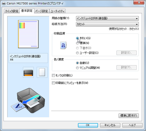 「基本設定」タブをクリックし、[用紙の種類(Y)]の一覧から目的の用紙の種類を選択します。 | ||||||||||||||||||