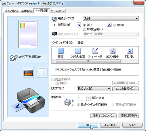 「ページ設定」タブをクリックし、[用紙サイズ(Z)]の一覧から「はがき」を選択して、印刷の向きを設定し、[OK]ボタンをクリックします。![]() |