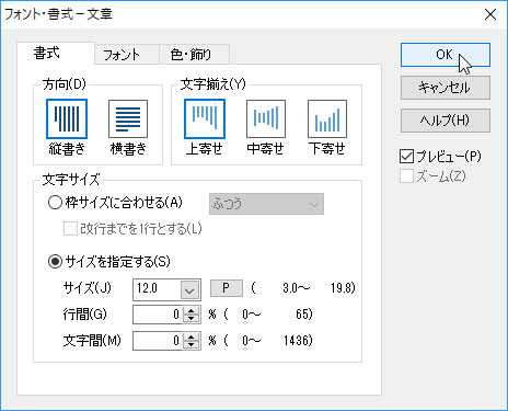 [縦書き]または[横書き]ボタンをクリックし、[文章枠を追加]ボタンをクリックします。![]() |