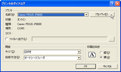 | はがきの文面を印刷するには、次のように操作します。 ※ここでは、Canon製のプリンタ「PIXUS iP8600」を例に解説します。なお、ドライバのインストールなどの準備はすでに終了し、プリンタが利用できる状態にあることとします。 |