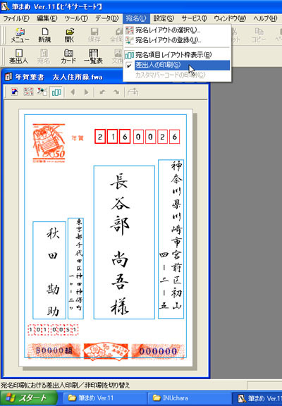 [宛名(L)]→[差出人の印刷(S)]を選択し、チェックボックスをONにすると、差出人情報が挿入されます。![]() |