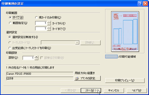[印刷範囲]で目的の印刷範囲をONにし、[次へ(N)>]ボタンをクリックします。![]() |