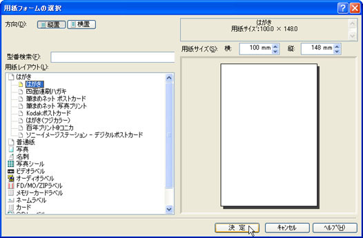 [用紙レイアウト(L)]の一覧から「はがき」を選択して、[方向(D)]の[縦置]ボタンをクリックし、[決定]ボタンをクリックします。![]() |