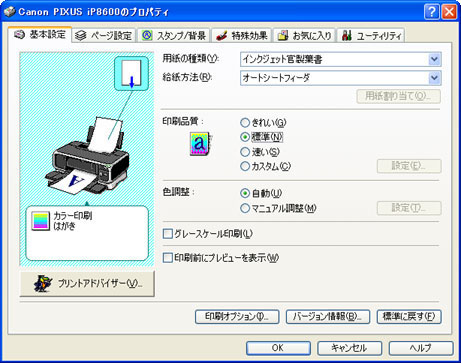 「基本設定」タブをクリックし、[用紙の種類(Y)]の一覧から目的の用紙の種類を選択します。 | ||||||||||||||||