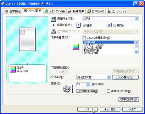 「ページ設定」タブをクリックし、[用紙サイズ(Z)]の一覧から「はがき」を選択します。![]() |