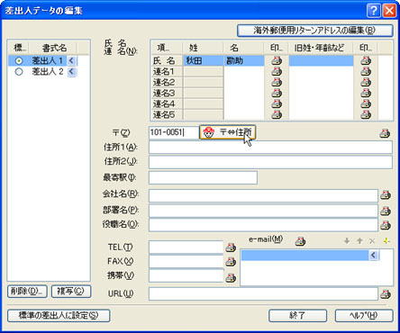 [〒(Z)]に郵便番号を入力し、[郵便番号⇔住所変換]ボタンをクリックします。![]() |