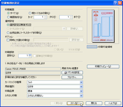 [印刷範囲]で目的の印刷範囲をONにし、[次へ(N)>]ボタンをクリックします。 |