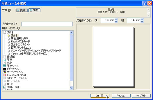 [用紙レイアウト(L)]の一覧から「はがき」を選択して、[方向(D)]の[縦置]ボタンをクリックし、[決定]ボタンをクリックします。![]() |