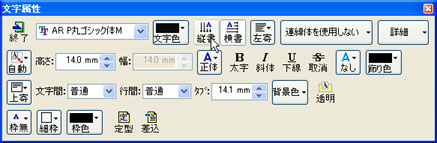 | (2) | 文字を縦書きにしたい場合は[縦書]ボタンをクリック(横書きにしたい場合は[横書]ボタンをクリック)します。 ![]() |