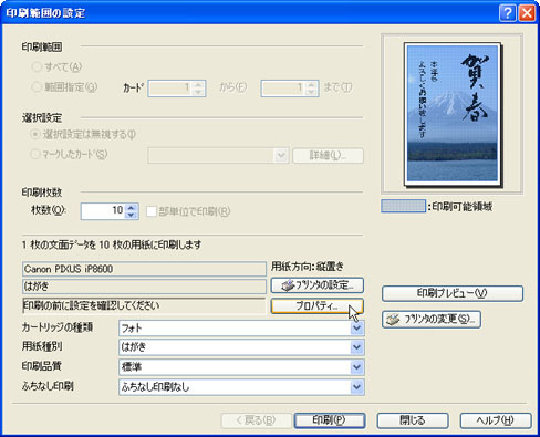 | はがきの文面を印刷するには、次のように操作します。 ※ここでは、Canon製のプリンタ「PIXUS iP8600」を例に解説します。なお、ドライバのインストールなどの準備はすでに終了し、プリンタが利用できる状態にあることとします。 |