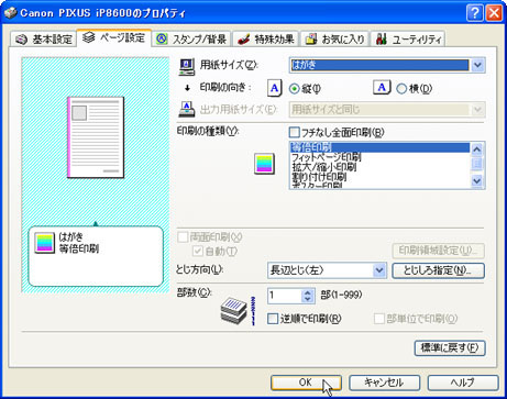 「ページ設定」タブをクリックし、[用紙サイズ(Z)]の一覧から「はがき」を選択します。![]() |