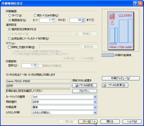 [印刷範囲]で目的の印刷範囲をONにし、[次へ(N)>]ボタンをクリックします。 |