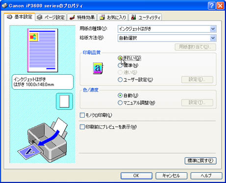 「基本設定」タブをクリックし、[用紙の種類(Y)]の一覧から目的の用紙の種類を選択します。 | ||||||||||||||||